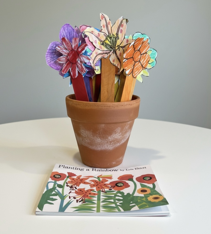 After reading “Planting a Rainbow” by Lois Ehlert, bring the rainbow to life using colored craft sticks and matching paper flowers. Invite children to sort their flowers by color, then attach each one to the coordinating stick. It’s a hands-on way to reinforce color recognition and fine motor skills. The best part? No green thumb required — just glue, giggles, and a whole lot of color.