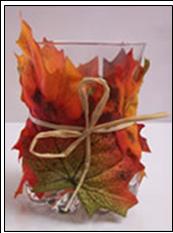 2. Glue the leaves (real, silk, or coffee filter from above) around the outside of the votive holder, glass, or baby food jar. You can arrange the leaves in any way you want.