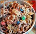 Mix all ingredients, except for the white chocolate chips. Melt those in the microwave, one bag at a time, until soft. Be careful not to over do it, they burn easily. Pour melted chocolate over the mixture and work together. Lay snack mix out on a wax paper to set. Once it’s hard, break up into chunks.