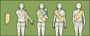 Pouches are the easiest type of sling to use. Pouches are our favorite baby sling for getting a baby quickly in and out. They must be sized to the individual, some people find them uncomfortable for long wearing since they go over only one shoulder. Newborns must be held in a reclining position.
