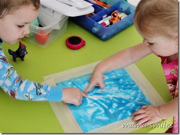 This activity is a super-simple way to let children finger paint without dealing with the mess! Use a plastic Ziploc bag (freezer works best, since the plastic is stronger), and add paint or a similar colored substance. We have used paint, shampoo, hair gel – you name it, and we have probably tried it. I think hair gel from the dollar store is our favorite texture! You can add food coloring or paint to the non-paint substances. I prefer to use washable paint, since the plastic bag can break, and it’s hard to get food coloring out of clothes – and even off of hands!