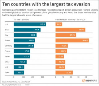 The Internal Revenue Service (IRS) and popular media estimate that up to 90 percent of in-home childcare providers are paid illegal in cash, off-the-books.  The chart to the left shows that the World Bank and Reuters report that the United States has the most tax evasion than any other nation in the world.