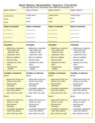 Plus, use our nanny agency contact checklist to the left to keep communication with nanny agencies organized. Email bethebestnanny@aol(dot)com for a copy of the nanny agency contact checklist.