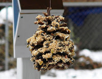 Start by typing a rope to the tip of the pine cone. Then let the kids spread peanut butter all over the pinecone and roll it in birdseed. Now just hang it from a tree and watch the birds go at it.