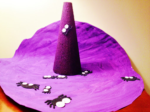 Once Halloween rolled around the umbrellas fell off and a witch hat emerged with some purple paint, a bit of paper, and plenty of spooky spider stickers.
