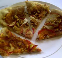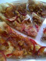 2. Slice apples. Toss with sugar and cinnamon to taste. Arrange individual slices of apple on entire pizza. Crumble topping over apples.