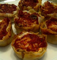 - Press another wonton skin down into the cup and then repeat the layers – 1 Tbsp. ricotta mixture, 1 Tbsp. sausage and 1 Tbsp. marinara sauce.