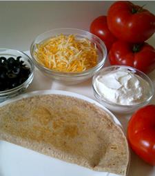 3. Sprinkle about a half cup of shredded cheese to just one half of the tortilla. Then add any other ingredients you would like to be hot such as chicken and peppers. (Save cold toppings such as sour cream, guacamole, and salsa for later).
