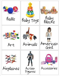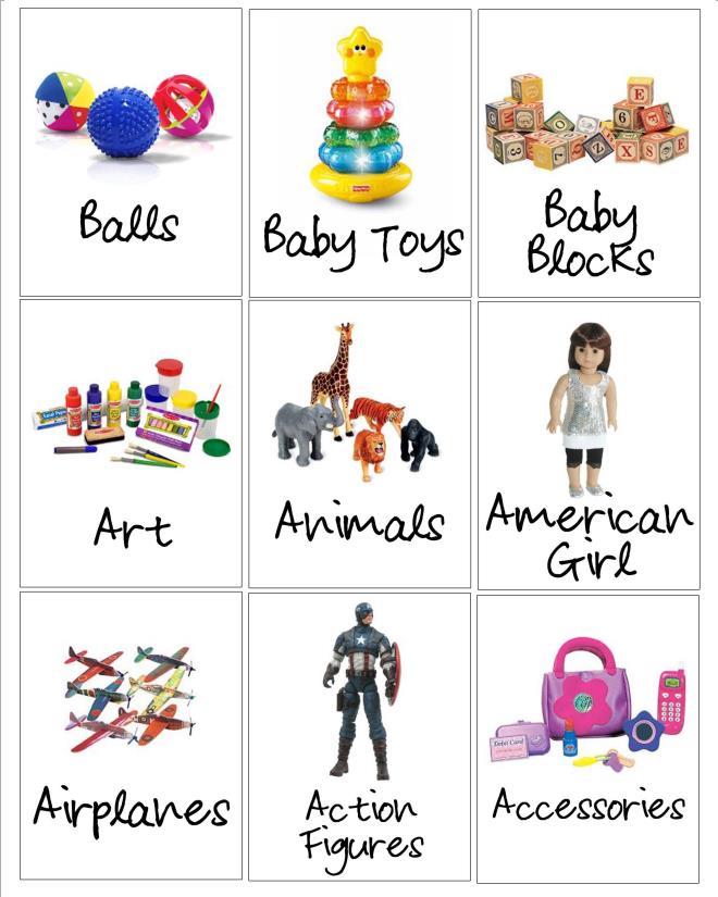 Buy clear tubs to store toys and stuffed animals. The clear tubs make it easier to see what is inside the container. Label the tubs with pictures for younger children that cannot read words yet. Get creative and let the kids help you label the boxes with photos or magazine clippings of the items. Cut out the picture of a toy from the box it came in and tape the picture of the toy to the spot where it belongs on toy shelves. Tape pictures or photos of what belongs in each dresser drawer to the front of each drawer. As children begin to read replace pictures. (see above left)