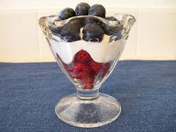 Layer the red berries on the bottom of a clear dish or bowl. Then add a layer of plain or vanilla yogurt. Top with a layer of blue berries.