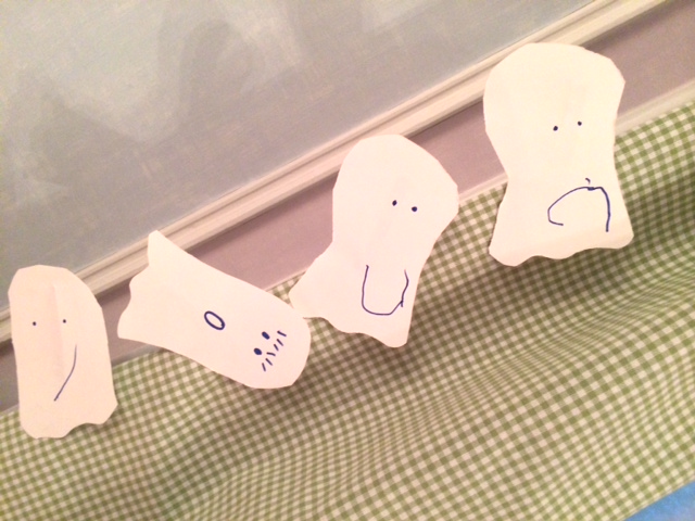 The little three-year-old I care for is just learning to use scissors and to draw happy and sad faces. I took her new obsessions and had her cut out pieces of white paper into ghost shapes and then she drew happy, sad, sleeping and surprised faces on the ghosts. We glued the moody ghosts onto wood clothesline pins and hung them in the curtains in her bedroom to make them look like they are flying.