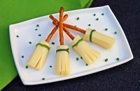 This is a healthy, quick and easy snack to make for the kids. You will need three sticks of string cheese, six pretzel sticks, and chives. Using kitchen scissors, cut the ends off each string cheese stick (about 2 inches long). Cut one end of the cheese into strips, being careful not to cut all the way to the top. Fan out cheese strips as best you can. Take one side of the scissors and gently stick it into the uncut side of the cheese, to make a little hole for the pretzel. Slowly twist the pretzel stick into the hole, careful not to tear the cheese. Tie a string of fresh chives around the top of each cheese piece. This recipe and photo are found at www.navywifecook.com