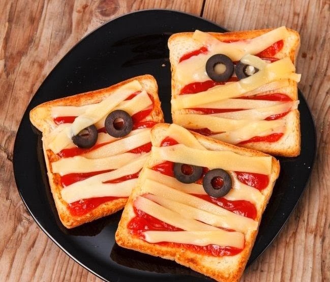 Maybe the best way we know to entice your kids to consume an actual dinner before they head out for trick-or-treating. Lightly toast slices of white or whole-wheat bread under the broiler. Top with pizza sauce, slices of white cheese (any kind) cut into bandage-like strips, and black olive eyes. Return to the broiler for just a few minutes to soften the cheese, and serve.