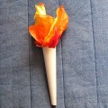 Paint the cardboard tube. Let dry. Decorate with painted swirls. Cut a 10″ square of tissue paper in yellow and orange. Push in the top to resemble a flame.