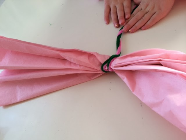 2. Tightly twist a chenille stem around the center of the folded tissue paper. (We twisted some of the stems with both pink and green chenille stems)