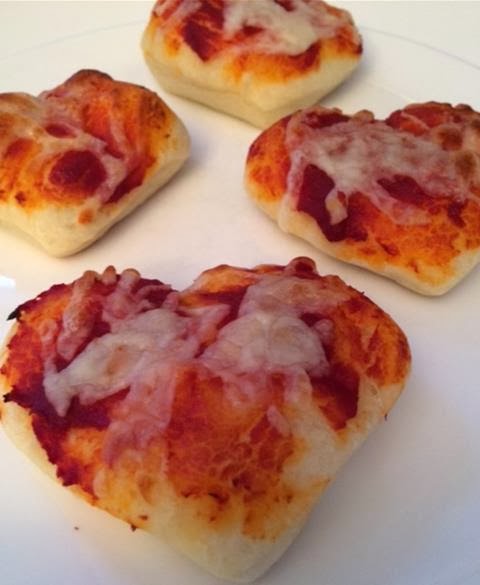 Use store bought pizza dough, a rolling pin, and cookie cutter to make this heart-shaped dinner. Preheat the oven to 450 F degrees. Put a little olive oil on your hands, a pastry mat, and rolling pin. Using a poultry scissor cut the pizza dough into balls the size of a tangerine or baseball (depending on the size of your heart cookie cutter). Roll out each ball of dough, then press out a heart with the cookie cutter. Spread a little pizza sauce on each heart and top with shredded mozzarella cheese (add toppings like pepperoni if the kids like the toppings). Bake in the oven for about 10-minutes or the cheese is golden brown.