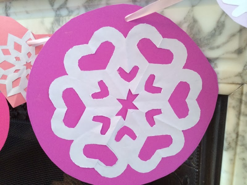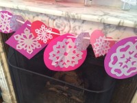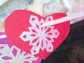 To make a paper snowflake garland like we did you simply need white and colored paper, safety scissors, glue sticks, a hole punch, and ribbon. Google “heart-shaped paper snowflake templates” and print out simple patterns. Allow the kids to cut out the snowflakes. Then, glue the snowflakes to Valentine-colored paper such as red, pink, or purple. Punch a hole on top of paper snowflakes and string with ribbon. Tape to a fireplace mantel, door frame, or above a window.
