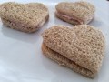 Use a rolling pin to flatten whole wheat bread. Using a cookie cutter we pressed out two hearts per slice of bread. Spread strawberry cream cheese or peanut butter and strawberry jelly between two hearts.