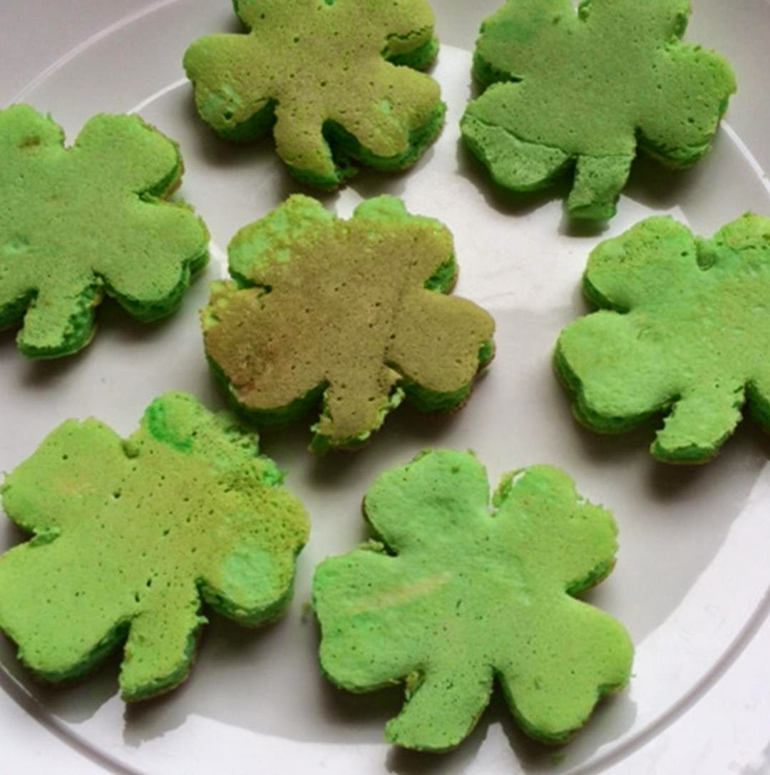 5. Remove pancakes and place on a cutting board or plate and press the shamrock cookie cutter into one pancake at a time to create green clover-shaped pancakes.