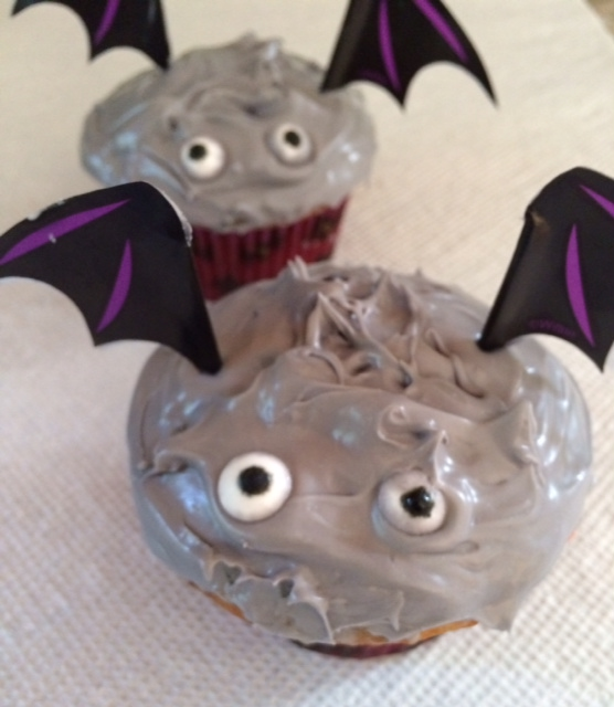 By far the easiest way to make a bunch of Halloween cupcakes, whether it be bats, mummies, witches, or jack-o-lanterns is by using a cupcake kit that includes all the ingredients needed for the project. We used toothpicks with little bat wings to make the bats pictured to the left. A little food dye changes frosting into any color needed.