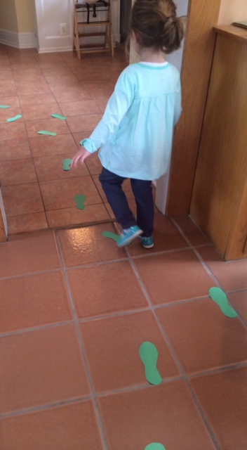 By far my favorite activity to do with kids on Saint Patrick’s Day is a game in which I have the kids follow leprechaun footprints.