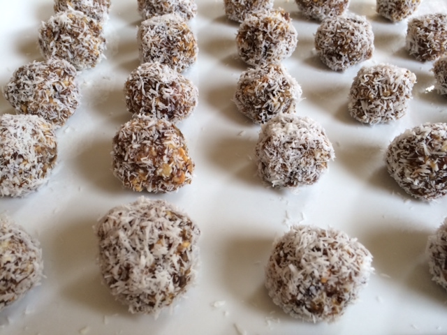 The key to making these treats palatable to the youngsters was to use a food processor to chop the nuts and dates as fine as possible. My charges love cashews but not many other nuts. I used a variety of fresh, raw, unsalted nuts for more nutrition. I just threw in a handful of almonds, walnuts, and macadamia nuts in the food processor with the cashews since they will never notice what types of nuts are in the snack.