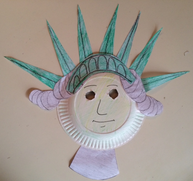 5. Once dry, tape a large, flat, wooden stick to the back of the paper plate so the child can hold the mask up to her face to pretend to be the Statue of Liberty.