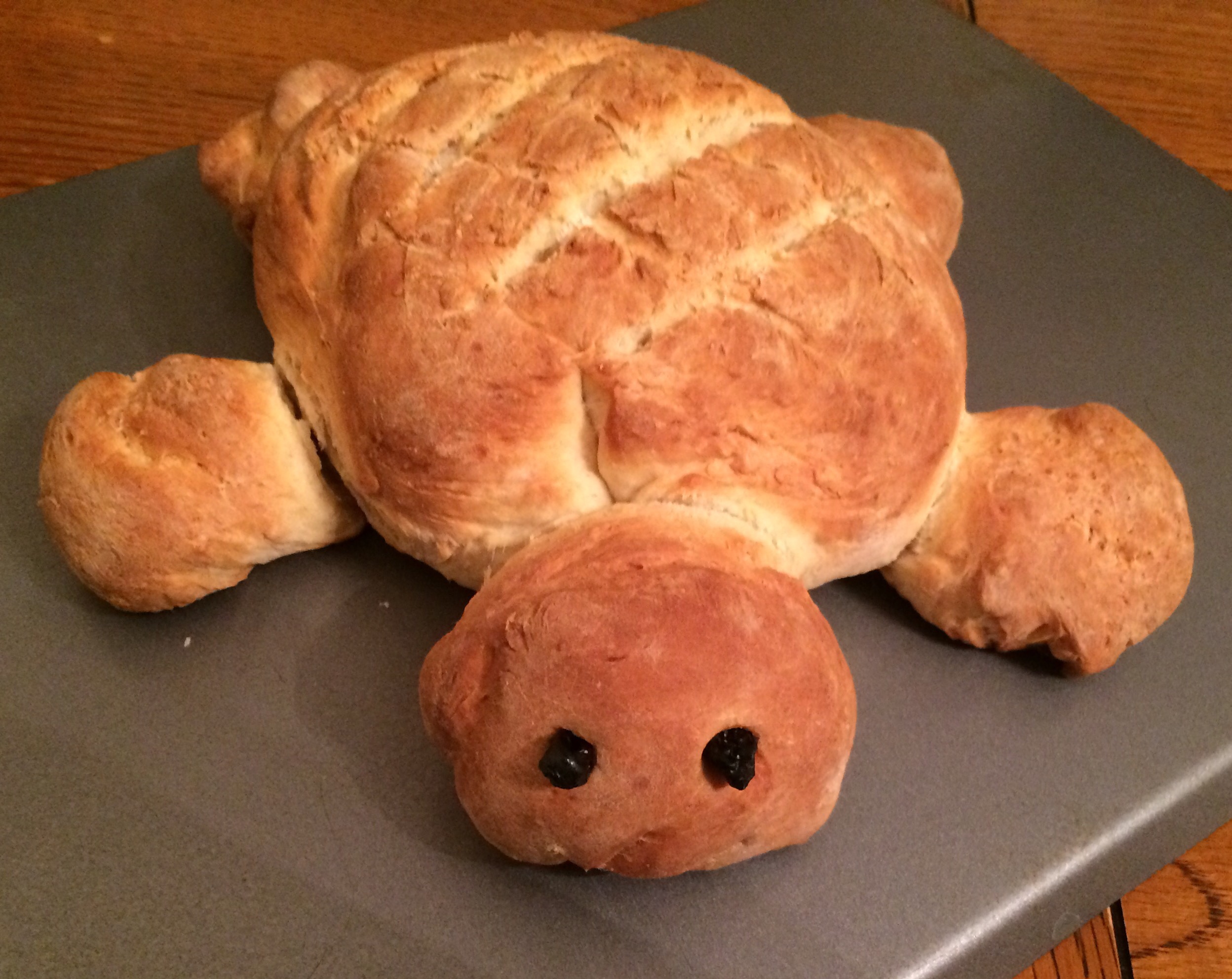 5. Heat the oven to 400 degrees Fahrenheit. Make crisscross cuts in the body, 1/4 inch deep, to look like a turtle’s shell. Bake until golden brown, 20 to 25 minutes.