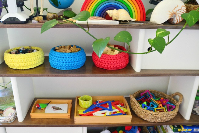 Use a simple approach to display fine motor, sensory, and developmentally appropriate activities your toddler is interested in. You can store these in different texture, color and size of baskets and trays. This keeps all materials accessible and organized for the child to use and know where to put them back after done playing with them.