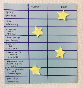 Make a star chart listing all of the mealtime manners you want the kids to follow. Perhaps start with one manner per week to work on together. If after the meal the child feels they have succeeded they can give themselves a star.