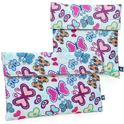 These reusable snack bags are made out of heavy duty polyester and lined with durable, washable, and stain-resistant aluminum film insulation. Thick materials retain the shape of your food and provide better resistance against crushing than plastic ziplock type bags. Strong stitching and secure velcro ensures that your lunch won’t fall out.