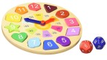 Learn counting, colors, shape recognition and how to tell time! This game is a puzzle and a game with 3 levels of play. Self-correcting spaces reinforce the position of every piece. Move the red hour hand to the correct number rolled on the red die. Next rotate the blue minute hand to the correct minute space. Take the piece out and flip it over to check to see if the minute piece matches what was rolled on the blue minute die.