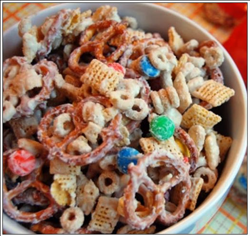3. Pour melted chocolate over the mixture and work together. Lay snack mix out on a wax paper to set.