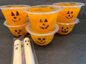 Using a Sharpie marker draw jack O’ lantern faces on fruit cups or oranges. Draw ghost faces on the cheese sticks.