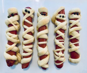 Kids love Halloween. This is a fun and simple lunch or snack to make with the children in preparation for the spookiest day of the year. These mummies taste just like pigs-in-the-blankets children enjoy as hors d’oeuvres at parties. Allow your Nanny Kids to roll out the dough and wrap it around their own hotdog.