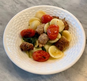 My Nanny Kids love pasta. But I’m so tired of serving marinara sauce on pasta. Since my Nanny Family likes sweet sausage, I added the meat and some vegetables to a light wine sauce this week instead of serving a red sauce. The alcohol cooks off so no worries serving wine sauce to minors. To make it even healthier, opt for organic, whole grain pasta to add fiber, add whatever veggies you have in the fridge, and use lean turkey sausage instead of pork.