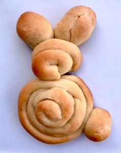 These are a perfect little roll to make with your nanny kids for Easter. I found this fun Easter roll on the tasteofhome web site. The best tip I have is to roll all the ropes of dough the same width and thickness. Then trim the ropes to the size needed for the part of the bunny’s body.