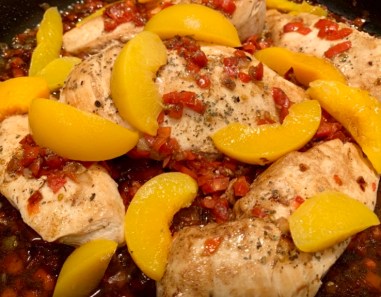 5. Return chicken to skillet, nestling between peaches and tomatoes, cover skillet with lid, reduce heat to medium-low and allow to simmer until chicken has cooked through (it should register 165 degrees on an instant read thermometer), about 6 – 9 minutes.