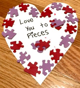 If you have puzzles with pieces missing this is the perfect Valentine’s project to make with your Nanny Kids. Otherwise, you can simply trace a few puzzle pieces onto Valentine’s colored paper and cut them out for this Valentine’s Day Card to make with kids of any age.