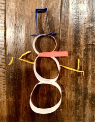3. Glue each of the white paper strips into a circle. Glue the three circles together to form a paper snowman body.