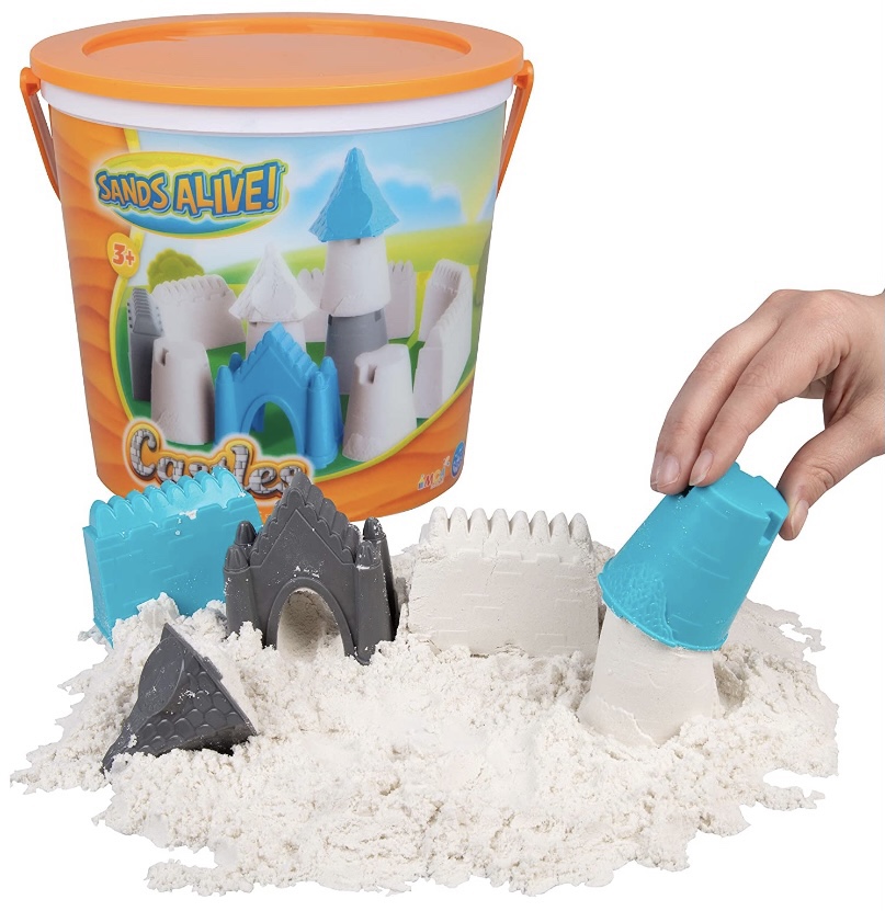 Sands Alive Castles Bucket comes with all the fun of sand, without the mess that can be used all year round. It looks and feels exactly like real sand without getting stuck under your nails, staining your skin, or damaging clothing! It is transportable and easy to clean. It is moldable, pliable, soft, and smooth. Build awesome castles and use you imagination. Provides hours of fun and entertainment for kids ages 3 and up.