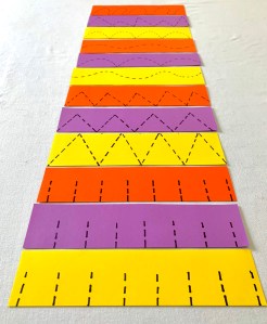 It’s easy to make cutting worksheets on your own for your nanny kids. The photo shows some cutting strips I made myself. I simply drew lines, dashes, and dots on colorful paper with a permanent marker to draw lines where the kids should cut the paper.