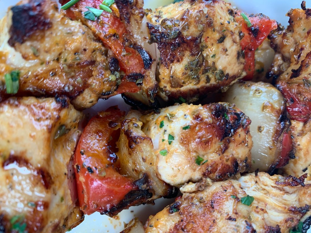 This is a delicious change from boring grilled chicken. The chicken is full of flavor and tender. This is an excellent main dish when served with pita bread, a garlicky tzatziki, and a Greek salad with olives and feta cheese. Lamb can be substituted for the chicken and add any vegetables your Nanny Family likes.