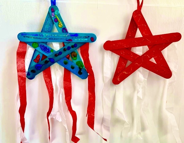 3. Once the starts are dry, slip them over and glue a ribbon to the top of the stars. Then glue an assortment of tissue paper streamers to the back of the stars.