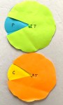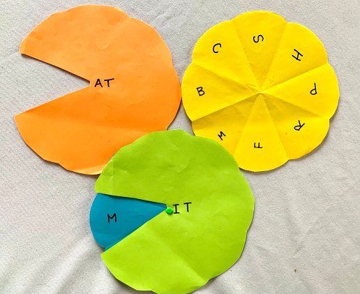 4. Cut out one triangle out of the other paper circle. Write the two the last two letters (suffix) of the word on this circle. Some suffixes could be “CK,” “OT,” “OP,” “IT,” “AT,” “IG,” “OG,” or “TH.”