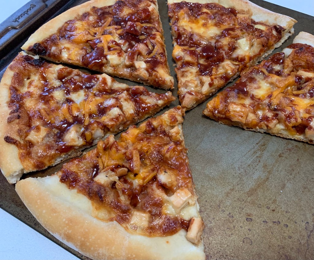 I’m allergic to tomatoes. So the typical pizza with red sauce doesn’t work for me. But this easy barbecue chicken pizza is so delicious. Your Nanny Family will love it and the kids enjoy helping make pizza. It’s easiest to make this pizza with store or bakery bought pizza dough and rotisserie chicken.