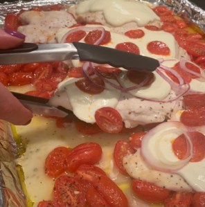 3. Season chicken on all sides with pepper and remaining 1 tsp. salt and 1 tsp. oregano. Nestle chicken into tomato mixture. Roast until chicken is almost fully cooked through and tomatoes are starting to burst, 8–10 minutes. Arrange mozzarella rounds over chicken and tomatoes. Return to oven and roast until cheese is melted and chicken is fully cooked through, 2–4 minutes. Top with onion and peperoncini.