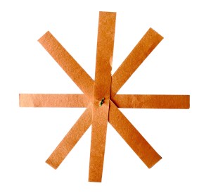 2. Once cut out, place four orange strips in an circular arrangement, (as pictured), and hold them in the event together using a split pin. Your child might find it easier if you poke through the ends of all the strips with a sharp pencil or craft knife first, and then your child can thread the pieces on to the split pin.
