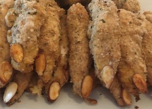 Some kids would eat homemade chicken fingers every day if I would make it for them. To add a Halloween vibe to baked chicken fingers I just added almond slices to the tips of chicken and told the children they are witches fingers. Allow the kiddos to dip their witches fingers into ramekins of blood (ketchup and barbecue sauce).