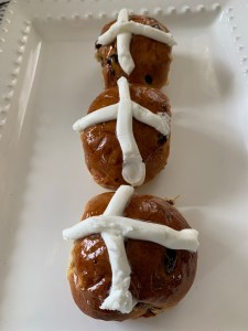 Hot cross buns are marked with a cross on the top. I have always associated them with Saint Patrick’s Day but my research shows that they are traditionally served on Good Friday and Easter morning. Here’s how I made these buns I found on the Taste of Home web site.